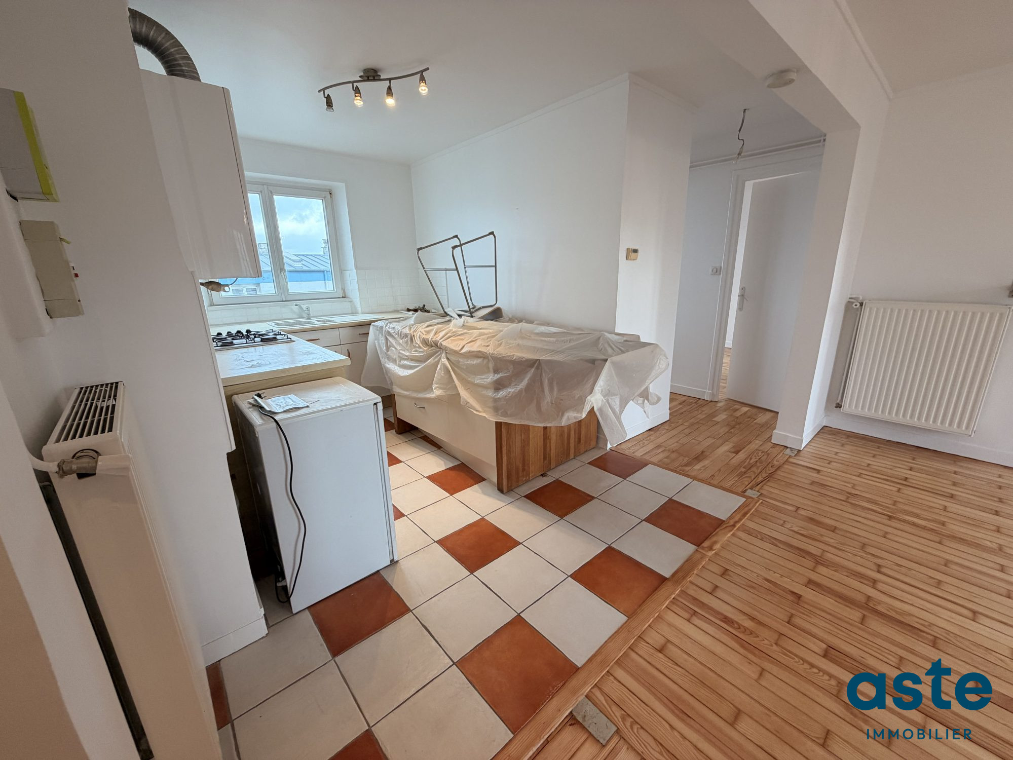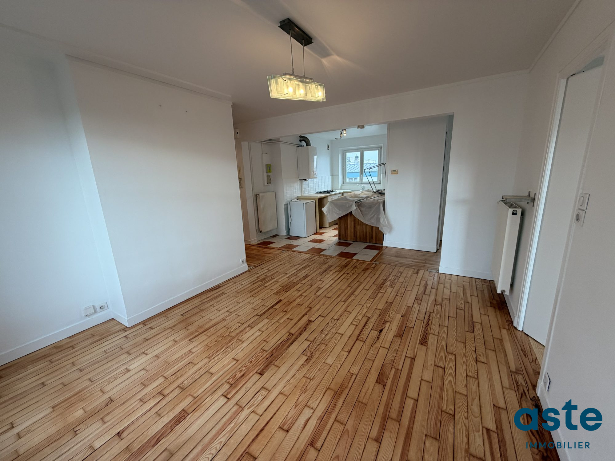 L’appartement se compose d’une entrée, d’un grand salon-séjour avec cuisine ouverte, deux chambres, salle d’eau, wc.